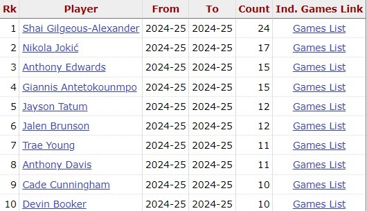 據(jù)統(tǒng)計,這是亞歷山大本賽季第25場比賽至少35分,聯(lián)盟最多,其余人最多17次。
