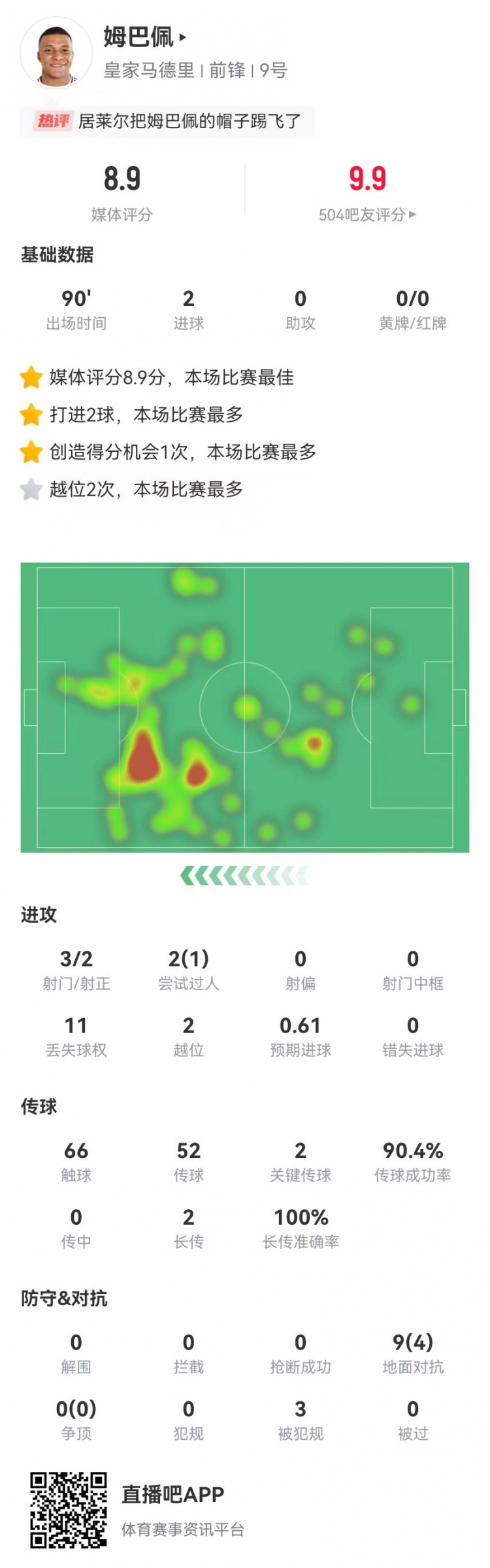3月16日訊 皇馬在本輪西甲2-1逆轉(zhuǎn)黃潛,姆巴佩本場(chǎng)數(shù)據(jù)如下: