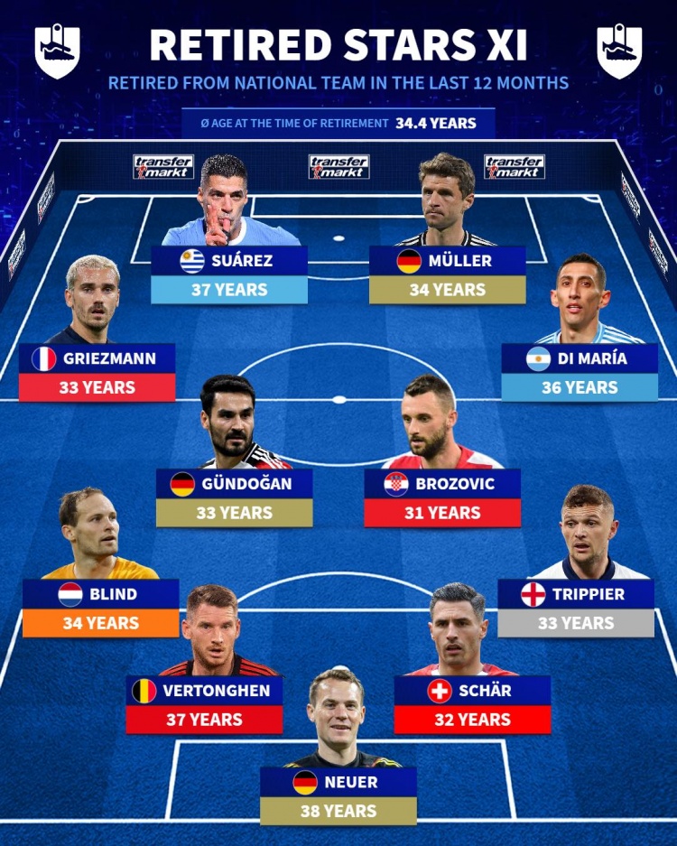 德轉(zhuǎn)列近一年國家隊(duì)退役球星陣容(平均年齡34.4歲)