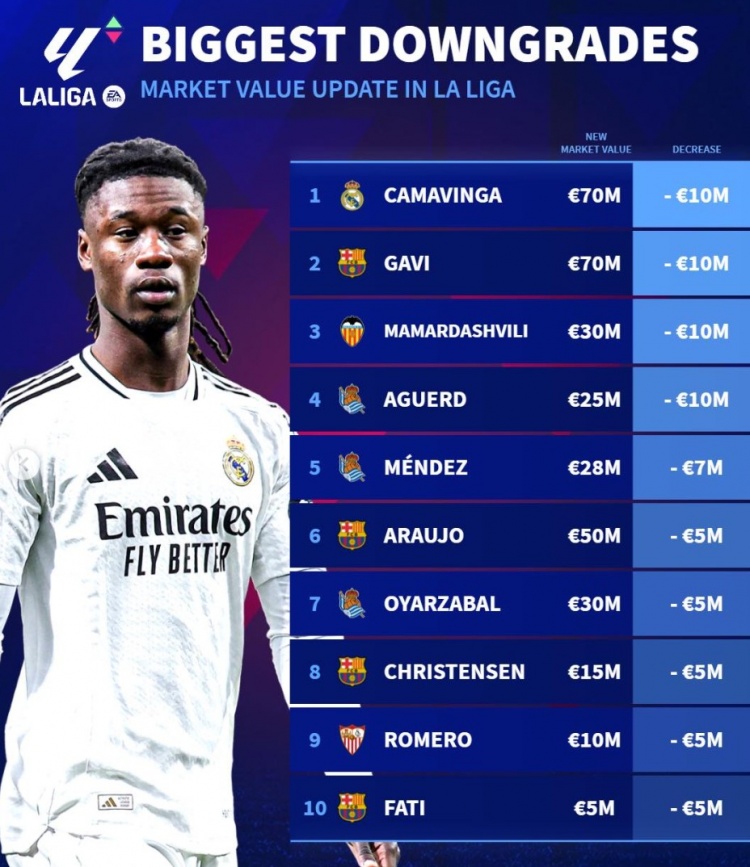 德轉(zhuǎn)列西甲身價(jià)貶值榜:歐元